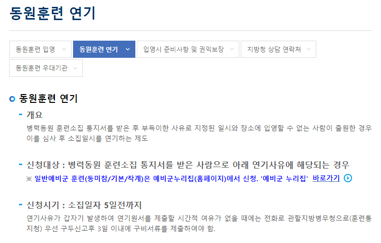 동원훈련 연기에 관한 사유와 처리 기준, 그리고 구비 서류에 대해 자세한 사항은 병무청에서 확인이 가능합니다.